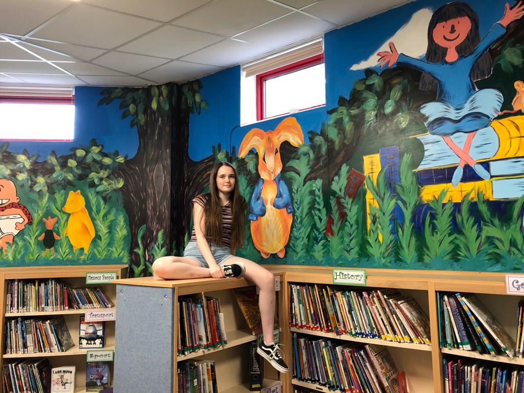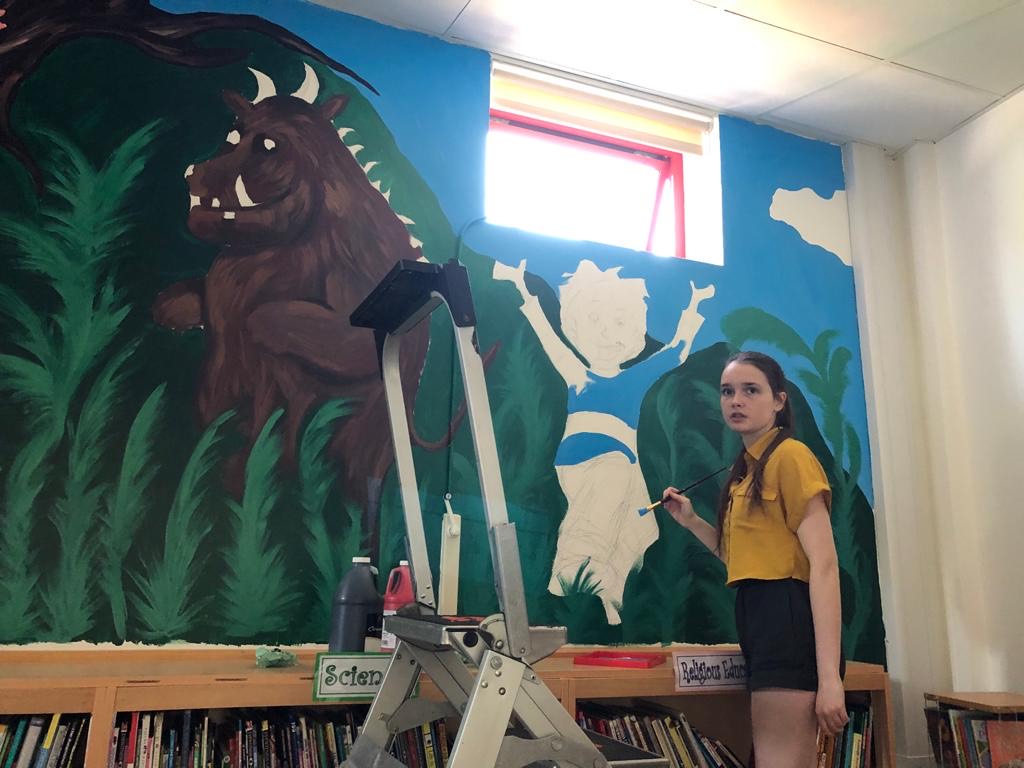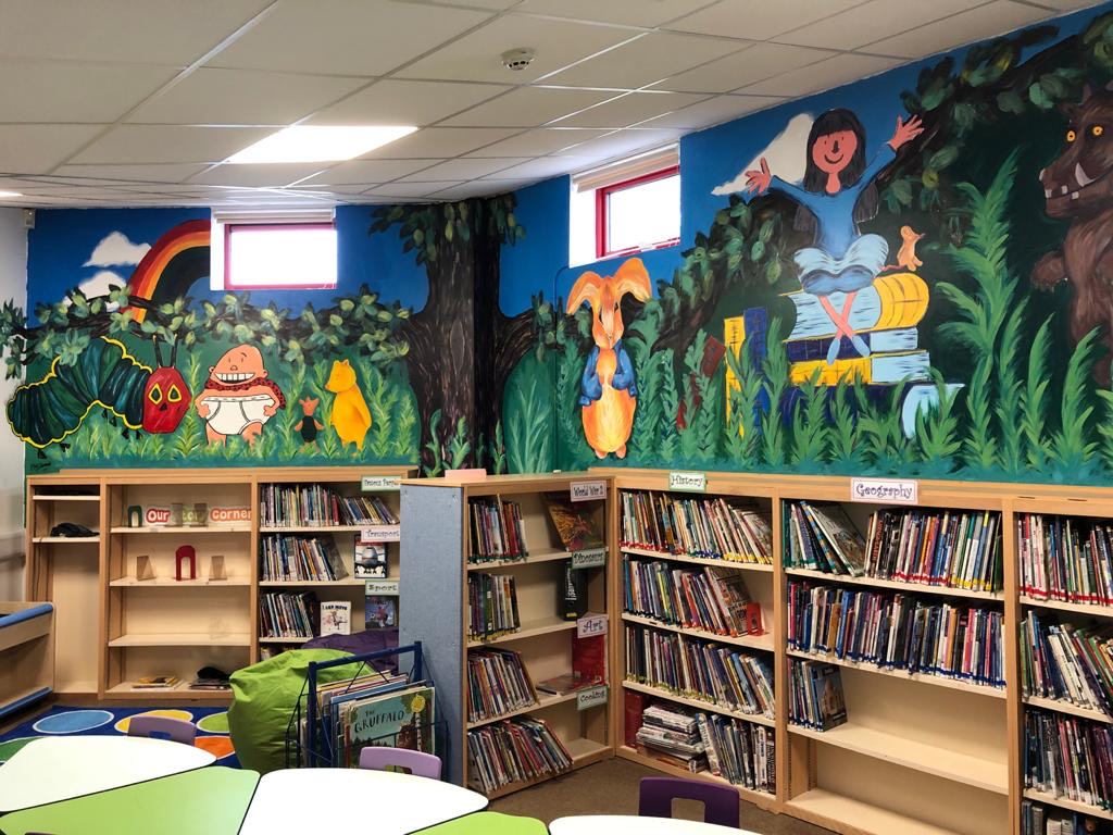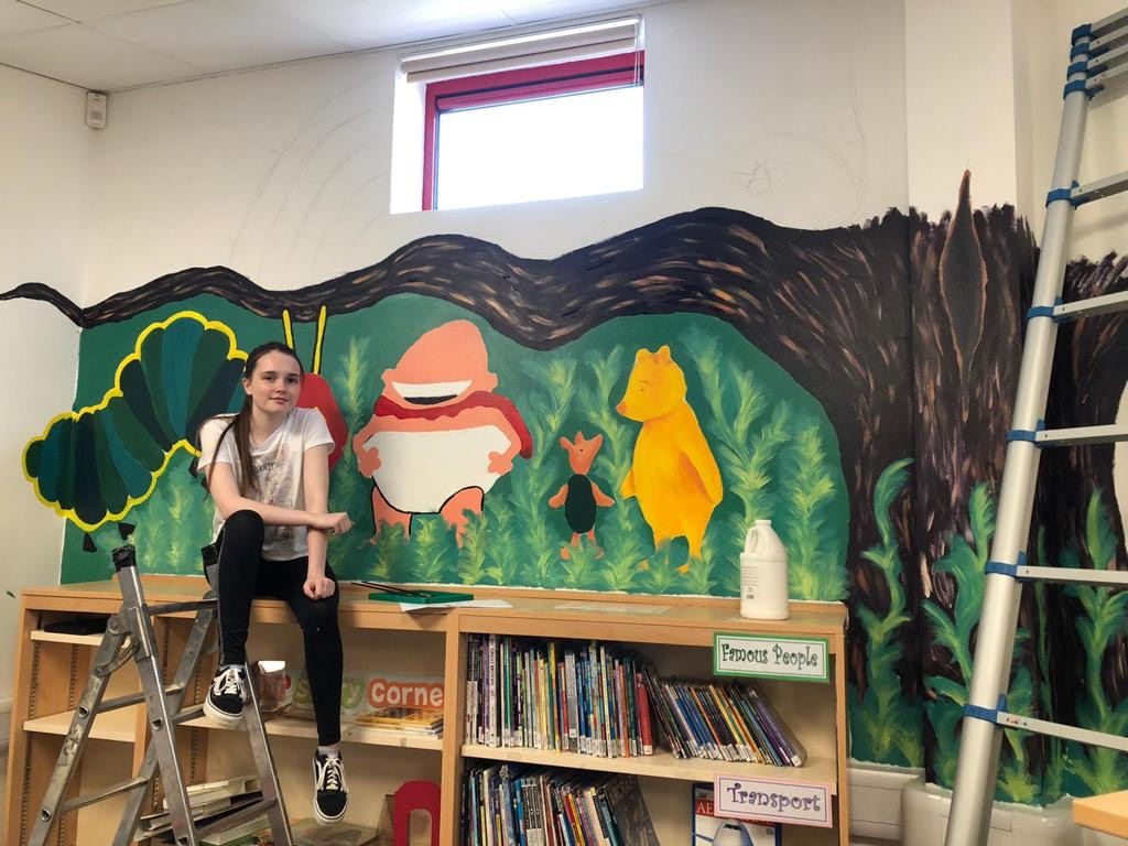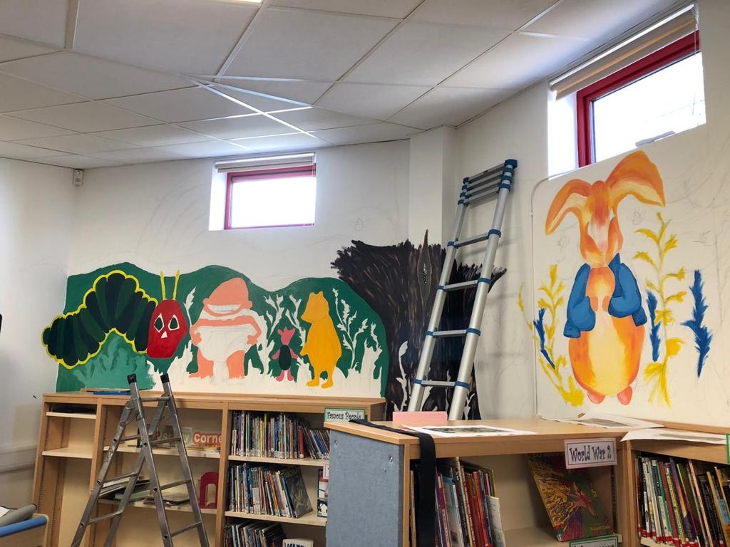 In the future if someone asked me to remember what I did in the 2020 global pandemic, I would say that I was 17 years old at the time and that this was the year I received my first ever commission as an artist. The commission was to design and paint a mural in the new library at St George’s Primary school. The mural had to include a number of famous characters from children’s literature and having seen the new space the architecture naturally lent itself to a mural that would wrap-a-round the whole of the library space. I decided to focus on using iconic children’s book characters so that the finished mural would stand the test of time and not become outdated. The characters I choose included the classic Hungry Caterpillar, Winnie the Pooh and Peter Rabbit montaged together with more contemporary characters such as Captain Underpants, Matilda and of course The Gruffalo; all of which sit beneath the shade and protection of an enormous tree. I very much hope that when the children come to see the new library that they are excited to find all of the characters they might have grown up with and are inspired to read about those might not yet know.