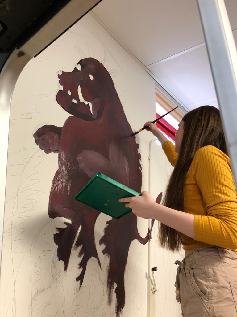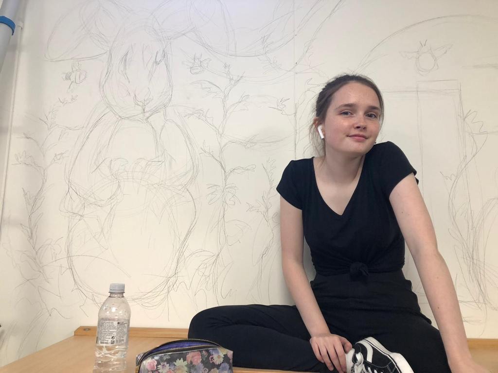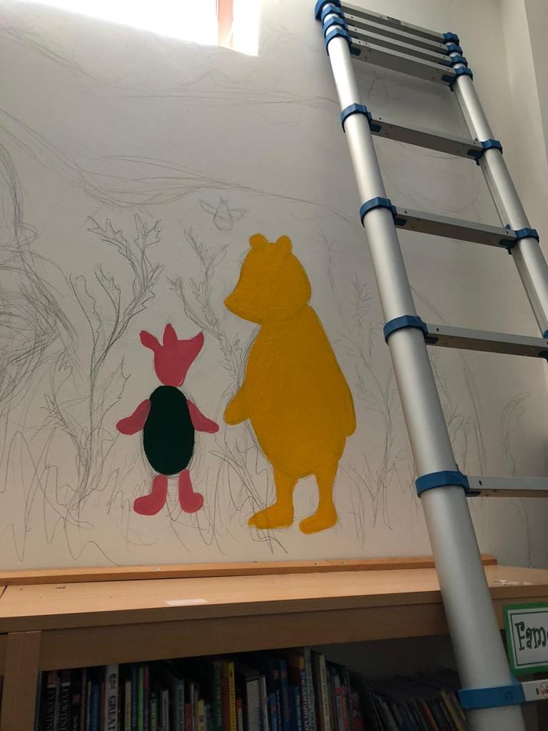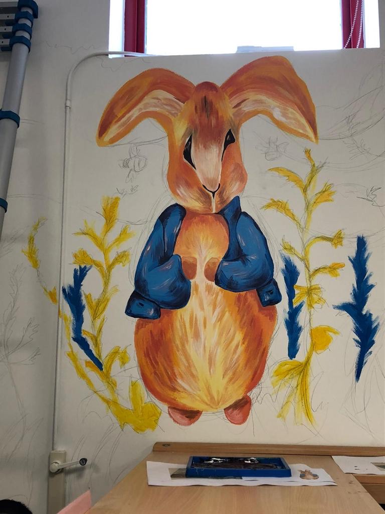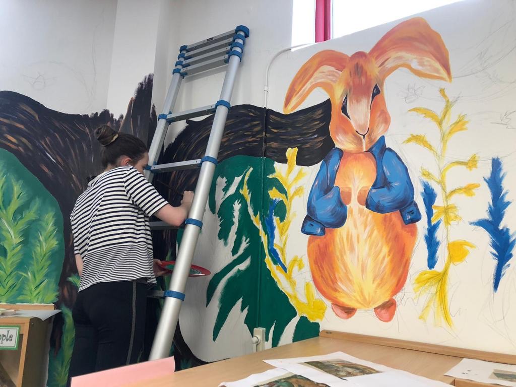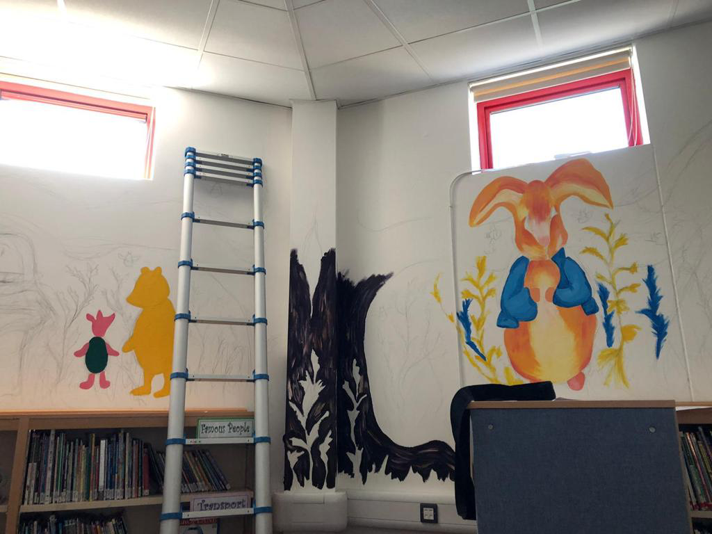 In the future if someone asked me to remember what I did in the 2020 global pandemic, I would say that I was 17 years old at the time and that this was the year I received my first ever commission as an artist. The commission was to design and paint a mural in the new library at St George’s Primary school. The mural had to include a number of famous characters from children’s literature and having seen the new space the architecture naturally lent itself to a mural that would wrap-a-round the whole of the library space. I decided to focus on using iconic children’s book characters so that the finished mural would stand the test of time and not become outdated. The characters I choose included the classic Hungry Caterpillar, Winnie the Pooh and Peter Rabbit montaged together with more contemporary characters such as Captain Underpants, Matilda and of course The Gruffalo; all of which sit beneath the shade and protection of an enormous tree. I very much hope that when the children come to see the new library that they are excited to find all of the characters they might have grown up with and are inspired to read about those might not yet know.