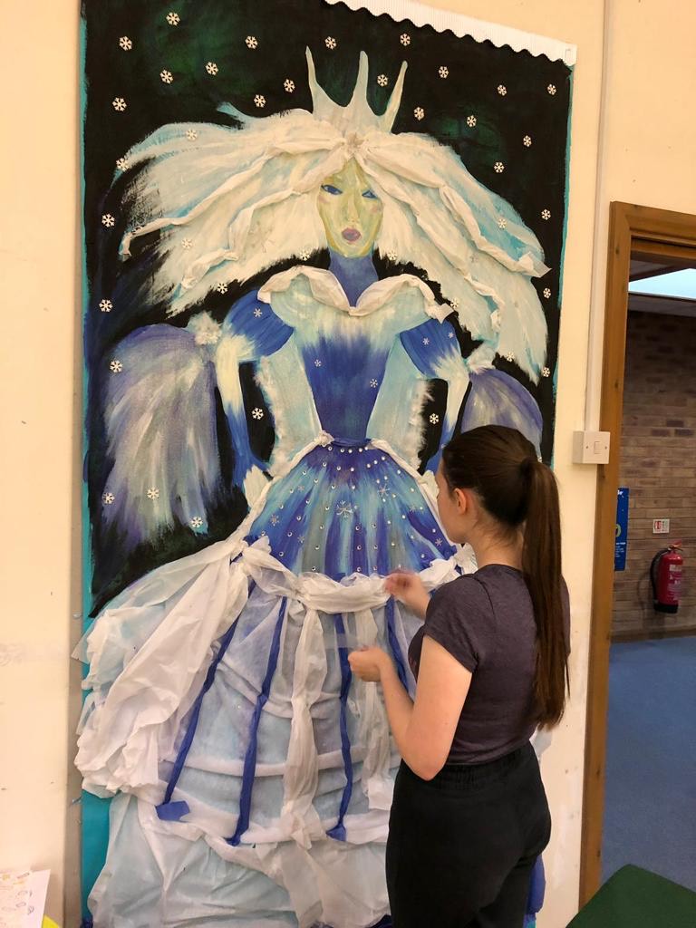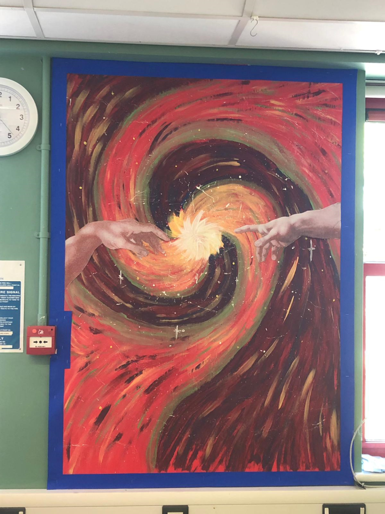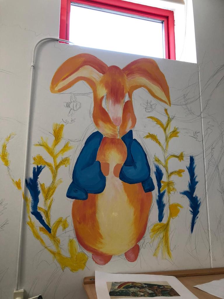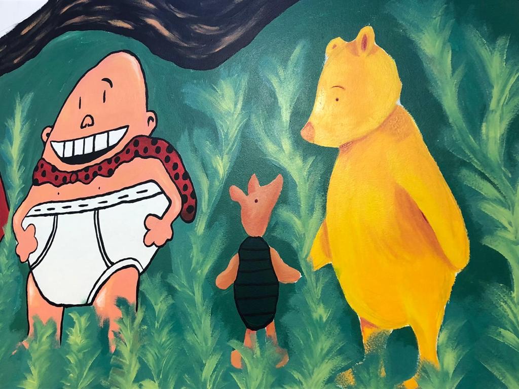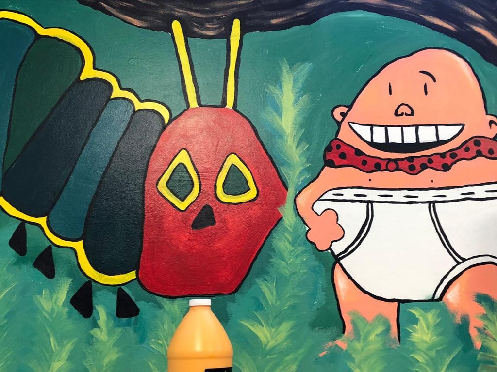 In the future if someone asked me to remember what I did in the 2020 global pandemic, I would say that I was 17 years old at the time and that this was the year I received my first ever commission as an artist. The commission was to design and paint a mural in the new library at St George’s Primary school. The mural had to include a number of famous characters from children’s literature and having seen the new space the architecture naturally lent itself to a mural that would wrap-a-round the whole of the library space. I decided to focus on using iconic children’s book characters so that the finished mural would stand the test of time and not become outdated. The characters I choose included the classic Hungry Caterpillar, Winnie the Pooh and Peter Rabbit montaged together with more contemporary characters such as Captain Underpants, Matilda and of course The Gruffalo; all of which sit beneath the shade and protection of an enormous tree. I very much hope that when the children come to see the new library that they are excited to find all of the characters they might have grown up with and are inspired to read about those might not yet know.