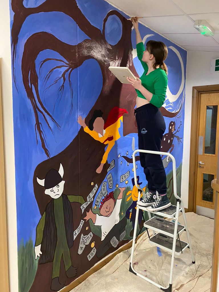Working with the children was a wonderful experience which greatly influenced my professional practice. The children thoroughly enjoyed taking part and running workshops was a very valuable skill which will help develop my professional confidence and open doors to running further workshops in the future. I have since been invited back to continue my work within the next academic year and have been given the role of Artist in Residence. I will continue to volunteer and paint murals whilst engaging with the children and enriching their learning and development outside of the classroom.
