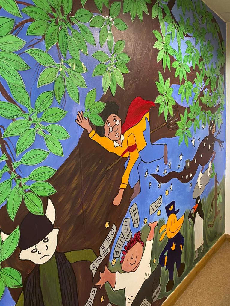 I was asked to paint a tree which the teachers could attach leaves to detailing the favourite books of all of the children and why they had chosen them.