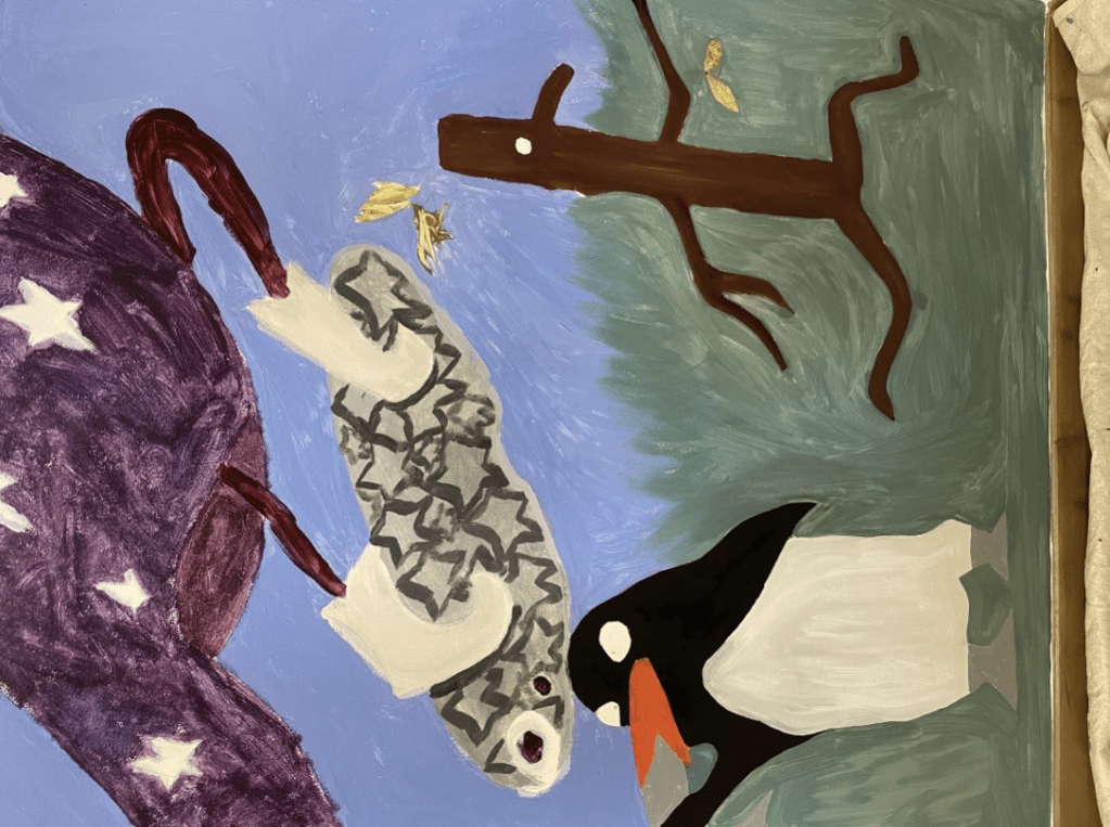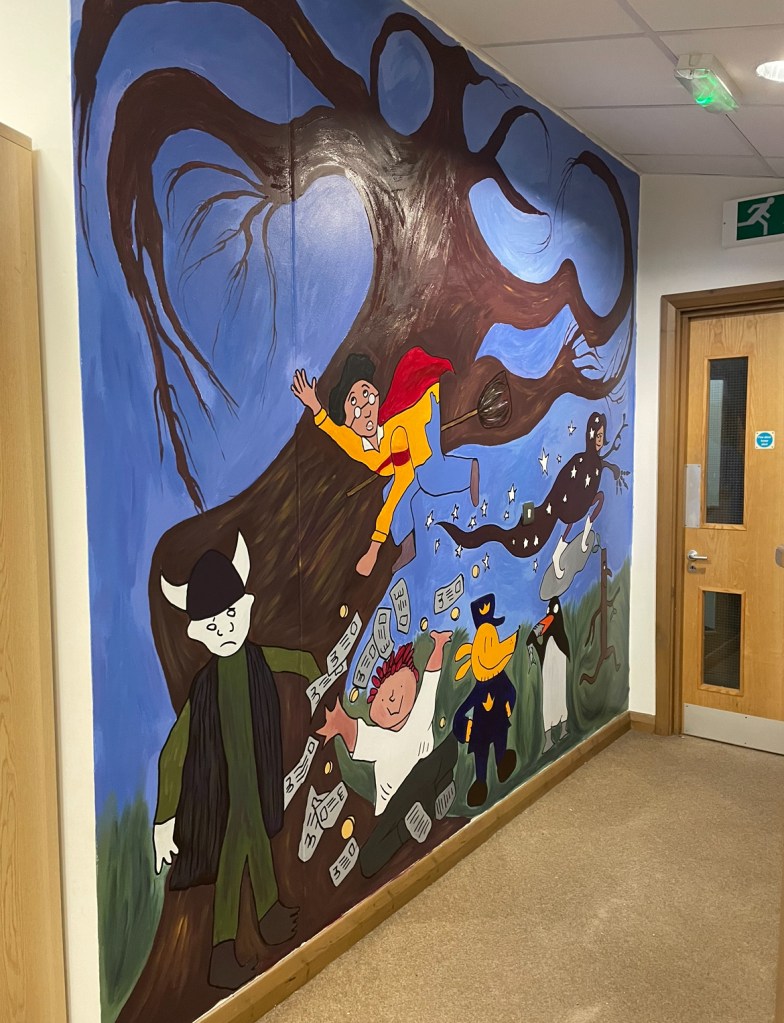 In December 2023 I was invited back to St George’s CofE Primary School after painting a mural for their new library in 2020. This year I was commissioned to paint another mural for another wall in the library in collaboration with the ‘Reading Dragons.’