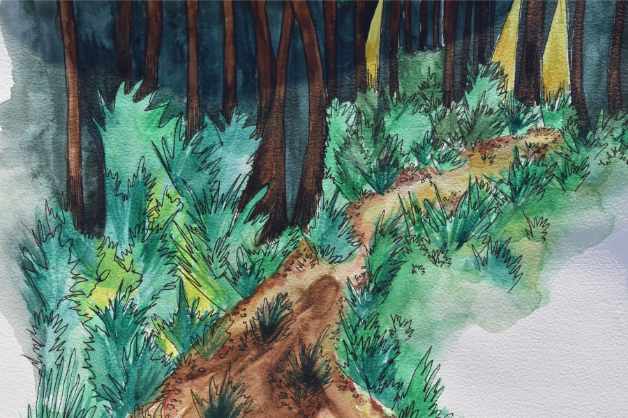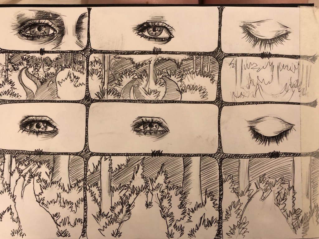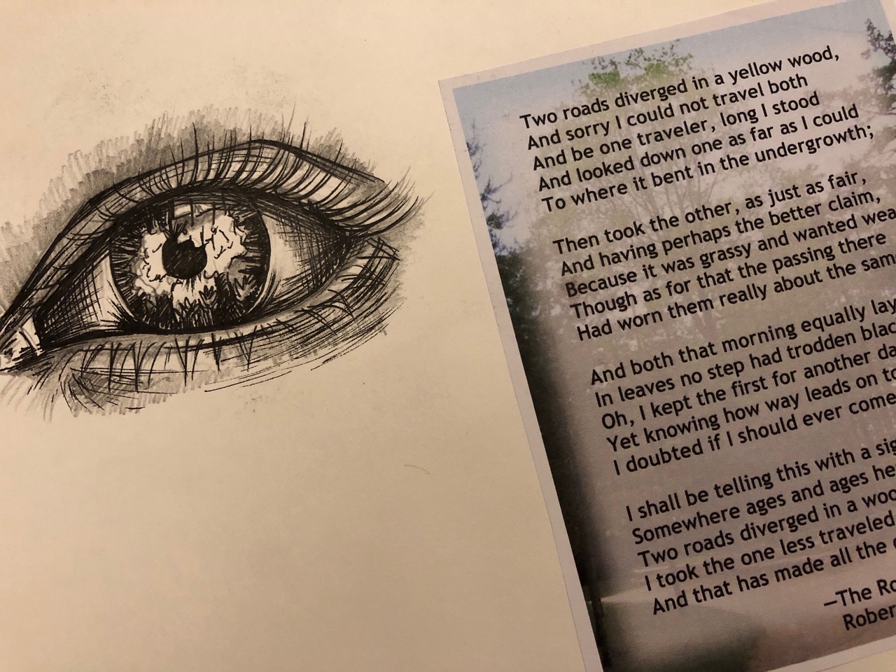 When I began created my animation I wanted to use the medium watercolour. The idea was to paint four different eyes in four different stages of blinking, with one eye completely closed and one eye open; so when I created the stop motion I could rotate through the different eyes to create the illusion that the eye was blinking. I then cut a hole in the eye where the iris should be and illustrated two backgrounds depicting the forest in which there are two paths, just like Frost states in the poem. I wanted to place the background behind the eye so you could see it through the iris, showing what the person would see as they were walking within the reflection of the eye.