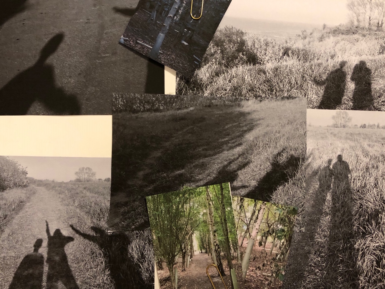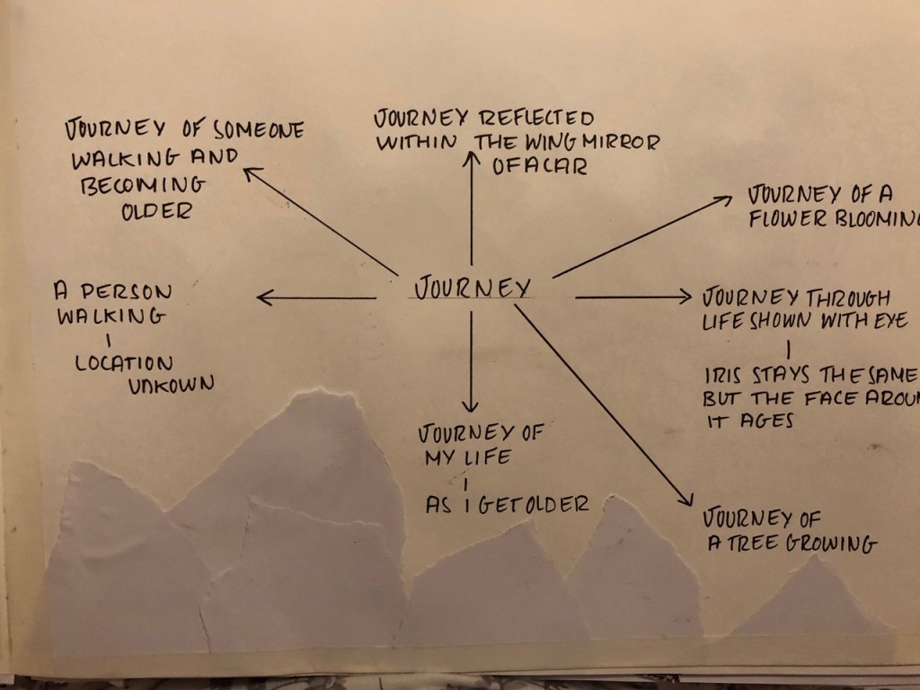 I began my exploration into the journey theme by creating a mind map of several different possible approaches that I could take. I initially explored the idea of drawing images from photographs of myself as I aged from a baby through to a toddler. However, I was not pleased with the outcome and chose a different approach to the task. This involved me using the poem by Robert Frost – ‘The road not taken.’ I decided to try and capture the journey depicted within the poem through the eye of the beholder. The animation would take the form of a blinking eye reflecting the path in front of it. To support my visual image making I took some of my own photography in some woods near where I lived to capture the subject of my animation. I edited these on Photoshop. In addition, I explored shadows of human forms on the path in front of me, which I also took some of my own photography for as references. From that point I began to develop my storyboard, from which the eye became the significant feature. I then began to develop a number of observational studies of the eye which I then reproduced in water colour a number of times to create the animation of the blinking eye. Once I had created 4 paper cut outs of each stage of the eye blinking, I cut out the iris to enable the viewer to see the wood images through the eye of the beholder. I created two different woodland scenes which were then moved as the animation was produced to suggest the person was walking and to show the journey along the path.